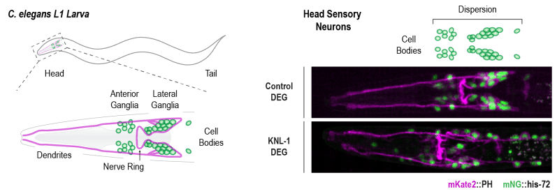 The C. elegans model is a powerful system to study how cytoskeletal regulators (like the kinetochore) shape the nervous system. We have found that kinetochore proteins regulate axon and neuronal cell body positioning (please see the following publications from our lab: Cheerambathur 2019 and Ouzounidis 2024).